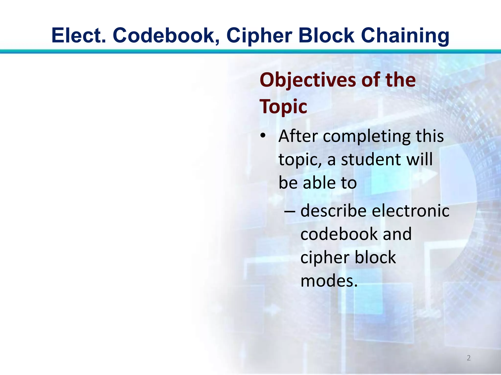 This document discusses two modes of operation for block ciphers: electronic codebook (ECB) mode and cipher block chaining (CBC) mode. ECB encrypts each plaintext block independently with the same key, resulting in the same ciphertext if the same plaintext is repeated. CBC improves on ECB by XORing each plaintext block with the previous ciphertext block before encryption to prevent repetitions in the ciphertext. The document outlines the encryption and decryption processes for ECB and CBC, noting that CBC is more secure for long messages.