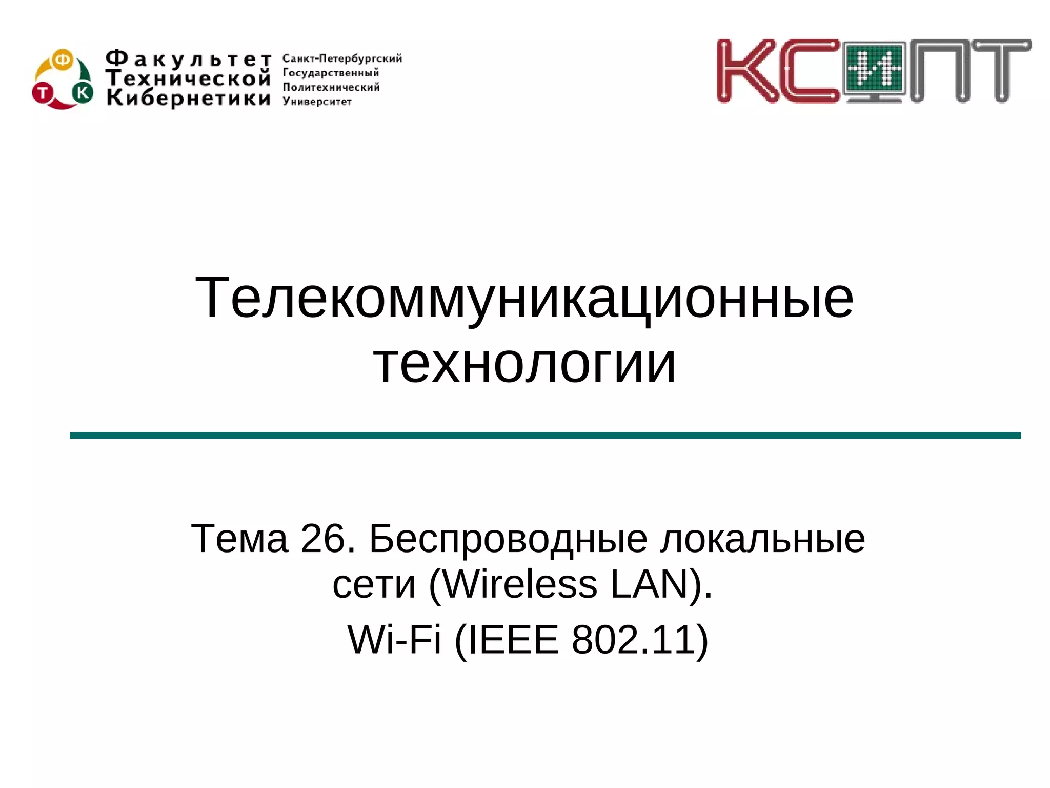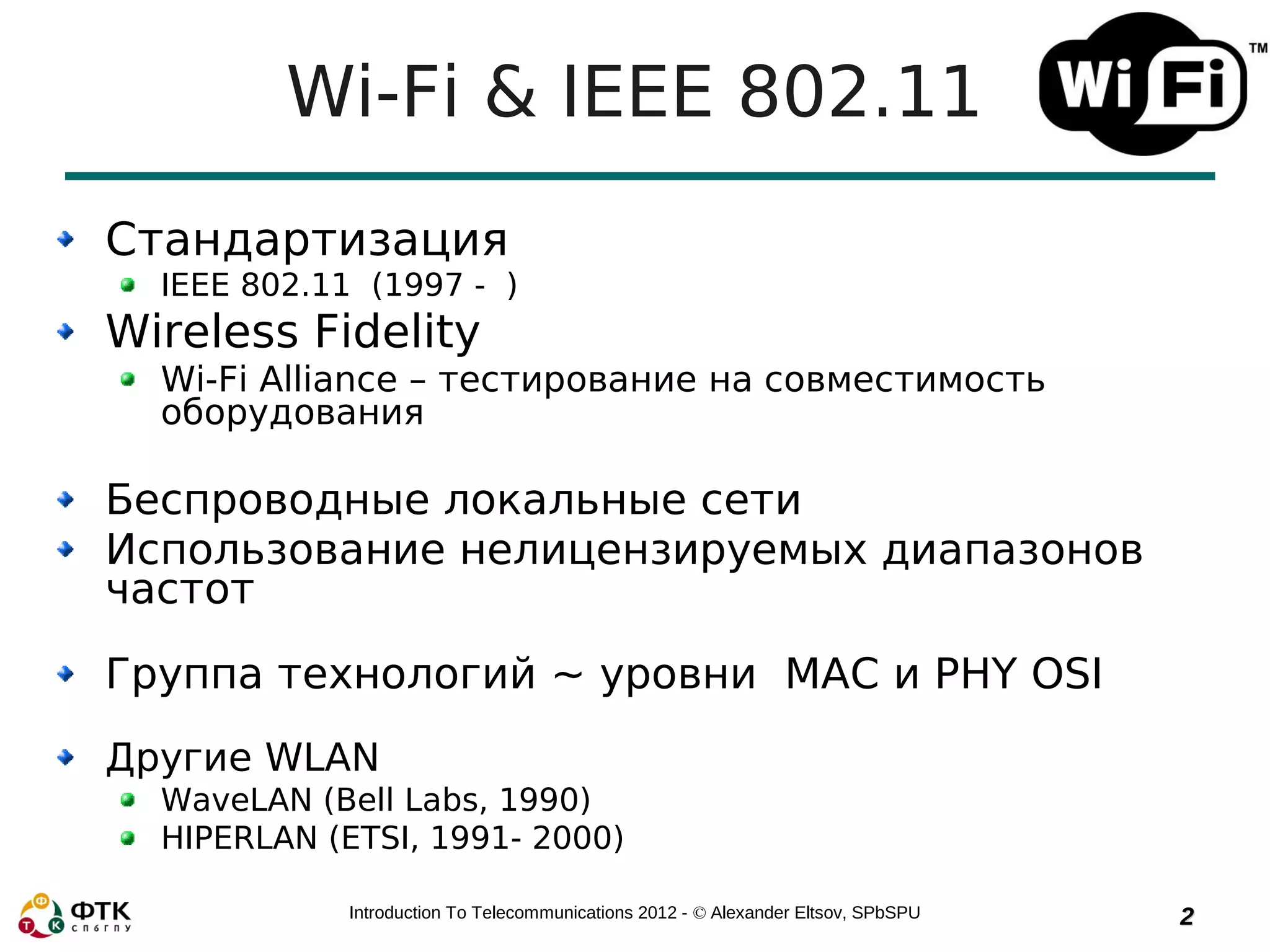 Документ посвящен беспроводным локальным сетям (WLAN) и стандарту Wi-Fi (IEEE 802.11), охватывая их историю, применение, преимущества и недостатки. Описываются различные типы оборудования, технологии передачи данных, методы модуляции, а также вопросы безопасности сети. Также приводится информация о производителях оборудования и стандартах, охватывающих разные диапазоны частот и скорости передачи данных.