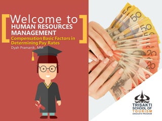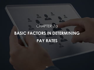 The document discusses the basic factors that determine pay rates, including job evaluations, salary surveys, and addressing issues of equity both within a company and compared to external market salaries. It provides steps for companies to establish pay rates, including determining the worth of jobs, conducting salary surveys, grouping similar jobs into pay grades, setting pay grade rates, and fine-tuning individual pay rates. Legal considerations that can impact compensation are also reviewed.