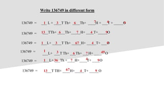 This document provides instructions to write the number 136749 in different numeric forms using place value. It then lists out six different ways to write 136749 using ones, tens, hundreds, thousands, ten thousands, and lakhs. Finally, it instructs to write the number 324836 and then in different forms.