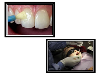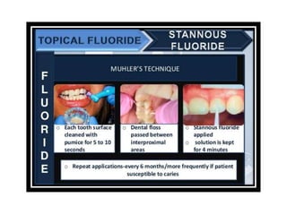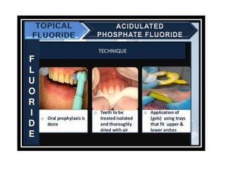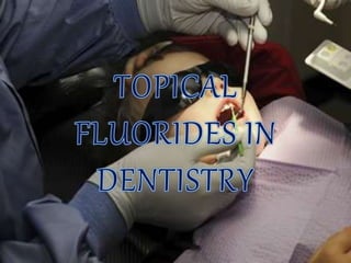 The document discusses the use of fluoride in dentistry, focusing on delivery methods, types of fluorides, and their applications in preventive dental care. It distinguishes between topical and systemic fluorides, and outlines the various types of topical fluorides, their indications, advantages, and techniques for application. The document emphasizes the importance of fluoride in preventing dental caries and provides a comprehensive overview of different fluoride agents used in clinical practice.