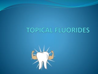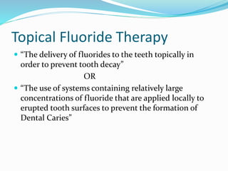 Topical fluoride therapy involves applying fluorides to the teeth to prevent tooth decay, utilizing both pre-eruptive and post-eruptive fluoride accumulation during enamel maturation. Fluoride functions by increasing enamel resistance, enhancing remineralization of incipient lesions, and interfering with oral bacteria. Various fluoride treatments are classified as operator or self-administered, with different mechanisms of action, applications, and recommended dosages for effective caries prevention.