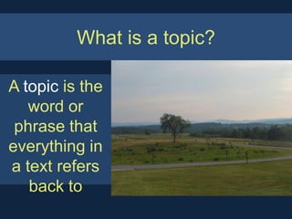 The document discusses how to identify topics and main ideas in nonfiction texts. It defines a topic as the overarching subject referred to throughout a text and explains the process of finding main ideas based on topics through analyzing repeated phrases and explicit statements. Various examples, such as discussions of water, Colonial Williamsburg, and fairy shrimp, illustrate the method for discerning main points and topics.
