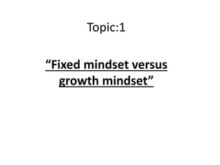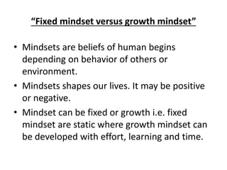 Fixed and growth mindsets are two types of mindsets that shape our lives. A fixed mindset believes talents and abilities are innate, while a growth mindset believes they can be developed through effort and learning. Those with fixed mindsets avoid challenges and criticism, while those with growth mindsets embrace challenges and learn from criticism. Developing a growth mindset involves embracing weaknesses, viewing challenges as opportunities, focusing on process over results, and accepting criticism.