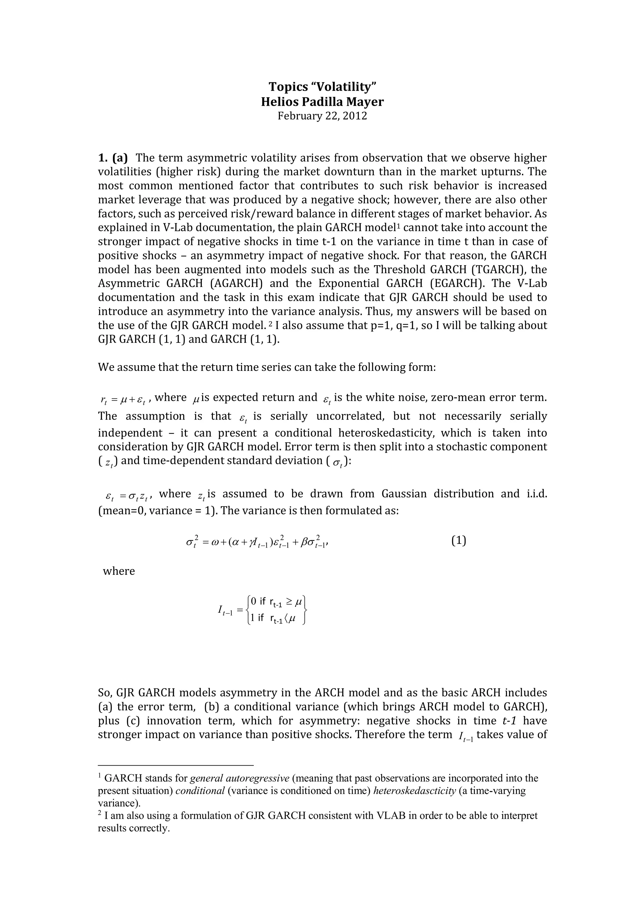 The document discusses asymmetric volatility, primarily focusing on the GJR-GARCH model, which accounts for increased volatility during market downturns compared to upturns. It compares volatility predictions using GARCH and GJR-GARCH models, highlighting the significance of capturing negative shocks for variance analysis. Additionally, it addresses short-term versus long-term volatility assessments and the relevance of implied volatility in risk management, particularly during financial crises.