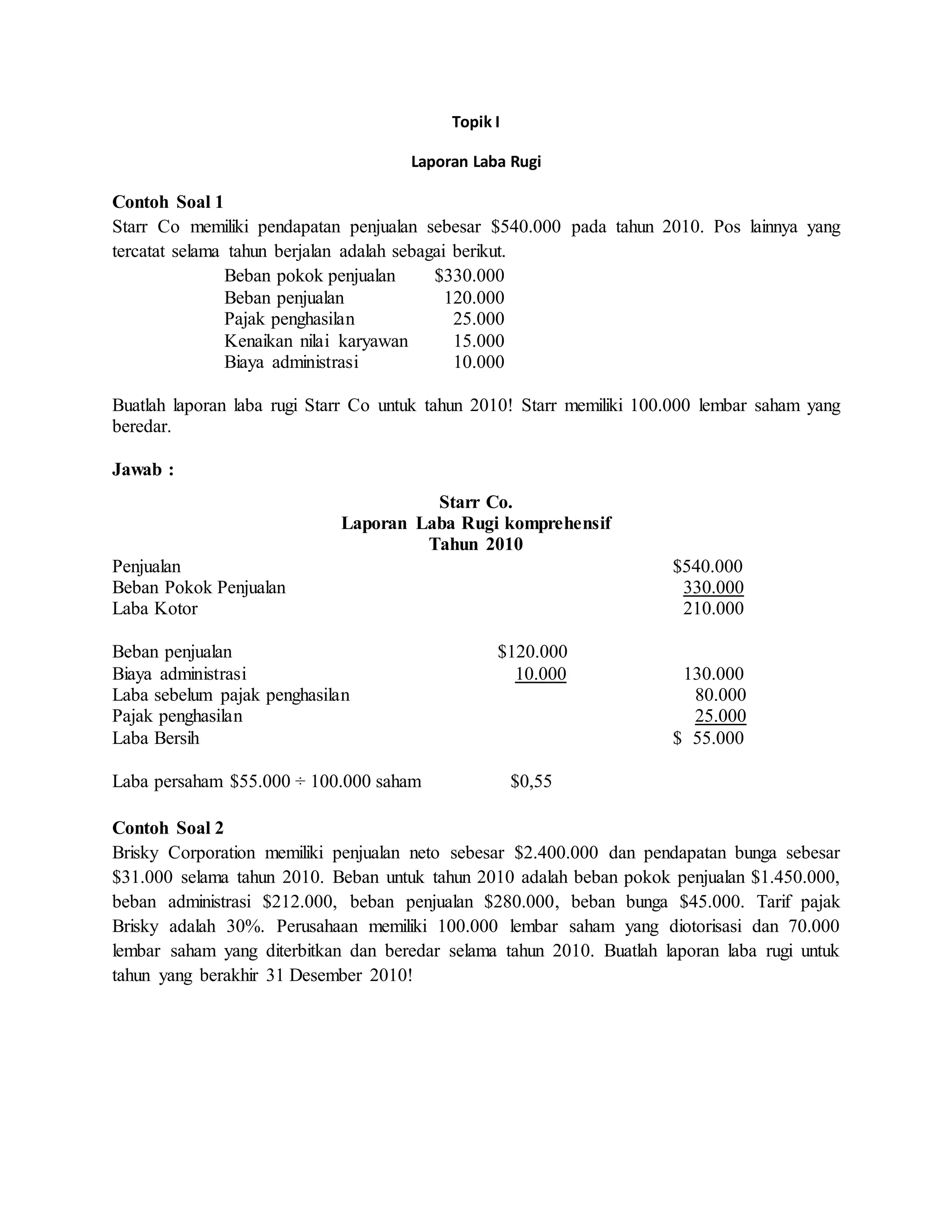 Dokumen tersebut berisi dua contoh soal laporan laba rugi perusahaan untuk tahun 2010. Contoh pertama adalah laporan laba rugi Starr Co dengan penjualan $540,000 dan laba bersih $55,000. Contoh kedua adalah laporan laba rugi Brisky Corporation dengan penjualan neto $2,400,000 dan laba bersih $310,800. Kedua contoh soal berisi penjelasan tentang pos-pos akun yang terkait dengan penjualan