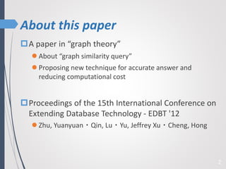 This paper proposes a new technique for top-K graph similarity queries that aims to reduce computational cost. It defines a new distance measure for graphs based on the maximum common subgraph (MCS). It derives several distance lower bounds to prune graphs from consideration without needing to fully compute the MCS. This allows reducing the number of expensive MCS computations. The techniques are evaluated on a real graph dataset to test their performance improvements over existing approaches.