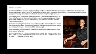 Topman appeals to a diverse range of consumer types due to its wide product range and variable pricing. Its target demographic is Generation Y males aged 16-25 who expect high quality customer service and are drawn to lifestyle brands that help express their identity. Key consumer segments for Topman include students aged 16-22 who are price conscious and influenced by peers; school boys aged 13-16 just beginning to choose their own clothing; young professionals aged 20-26 who shop for both work and leisure wear; and metrosexual males aged 16-24 who are fashion-conscious and interested in fitness and grooming. Topman competes primarily on bringing higher-end fashion to mass consumers in a more affordable way than direct competitors like Urban Outf