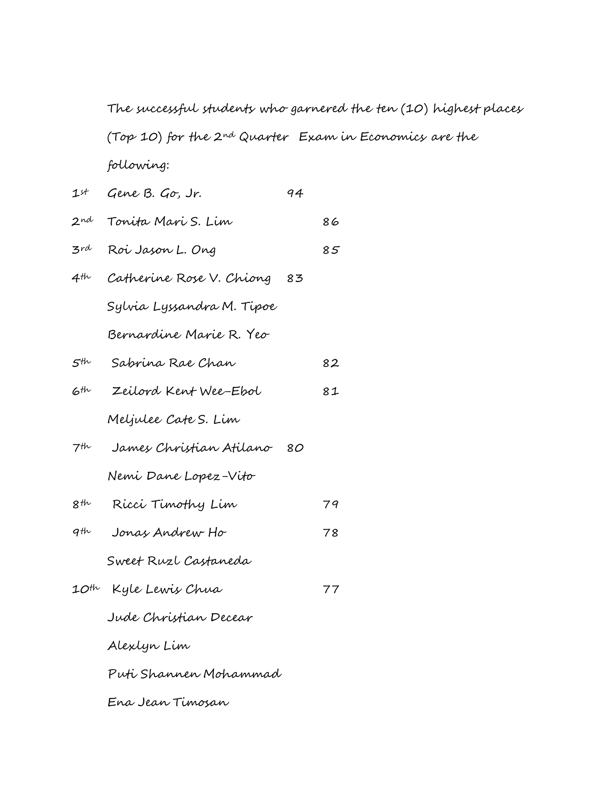 Gene B. Go, Jr. earned first place with a score of 94 for the Top 10 successful students in the 2nd Quarter Exam in Economics. Tonita Mari S. Lim and Roi Jason L. Ong followed in second and third place with scores of 86 and 85 respectively. The document then lists the remaining students who garnered a place among the Top 10 highest scores in the exam.