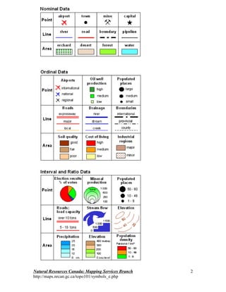 It includes tables that list specific features commonly mapped and the symbols used to represent each one.