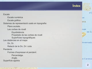 En les superfíciestopogràfiques, representades mitjançant corbes de nivell, es poden distingir una sèrie d'aspectes importants: LÍNIA DE MÀXIM PENDENT (LMP): Es la línia més curta que es pot traçar entre dues corbes de nivell consecutives.