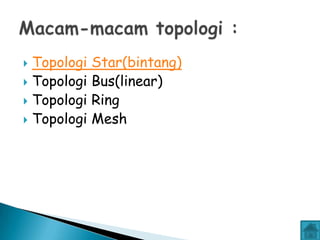 Dokumen ini membahas berbagai topologi jaringan, termasuk topologi bintang, bus, cincin, dan mesh. Setiap topologi memiliki kelebihan dan kekurangan, seperti kemudahan dalam pengembangan jaringan dan penghematan kabel, tetapi juga memiliki risiko seperti gangguan jaringan dan tabrakan data. Ringkasan ini memberikan pemahaman tentang karakteristik dan keterbatasan masing-masing topologi.