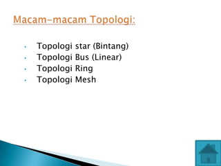 Dokumen tersebut membahas beberapa jenis topologi jaringan komputer yaitu star, bus, ring, dan mesh. Topologi star memiliki bentuk bintang dengan semua node terhubung ke titik pusat, bus menggunakan kabel tunggal, ring membentuk lingkaran, sedangkan mesh semua node saling terhubung.