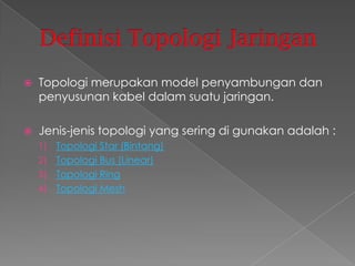 Topologi jaringan menjelaskan model penyambungan dan penyusunan kabel dalam jaringan, dengan empat jenis topologi yang sering digunakan yaitu star, bus, ring, dan mesh. Topologi star memiliki keuntungan seperti pemasangan yang mudah dan fleksibel serta deteksi kesalahan yang mudah.