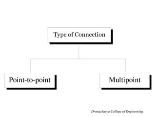 The document discusses different types of computer network topologies. It describes point-to-point, multipoint, mesh, star, tree, bus, and ring topologies. For each topology, it provides details on how the nodes are connected and lists some of their key advantages and disadvantages. Mesh topologies have every node connected to every other node, while star topologies connect all nodes to a central hub. Bus topologies use a single cable run that all nodes tap into.