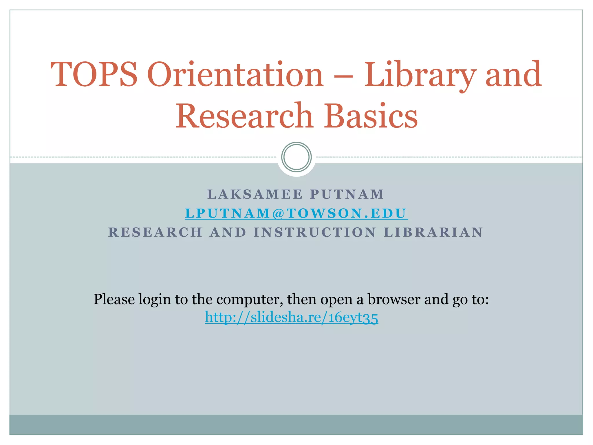 This document outlines a library orientation presentation on research basics at Towson University's Cook Library. It introduces Laksamee Putnam as the research and instruction librarian and provides an overview of the library's resources including 600,000 books, 150,000 e-books, 200 databases, and 50,000 e-journals. The presentation covers evaluating information sources, developing search strategies, searching the library catalog and databases, and provides examples of researching viral videos. Attendees are encouraged to ask questions of Putnam or other reference librarians.