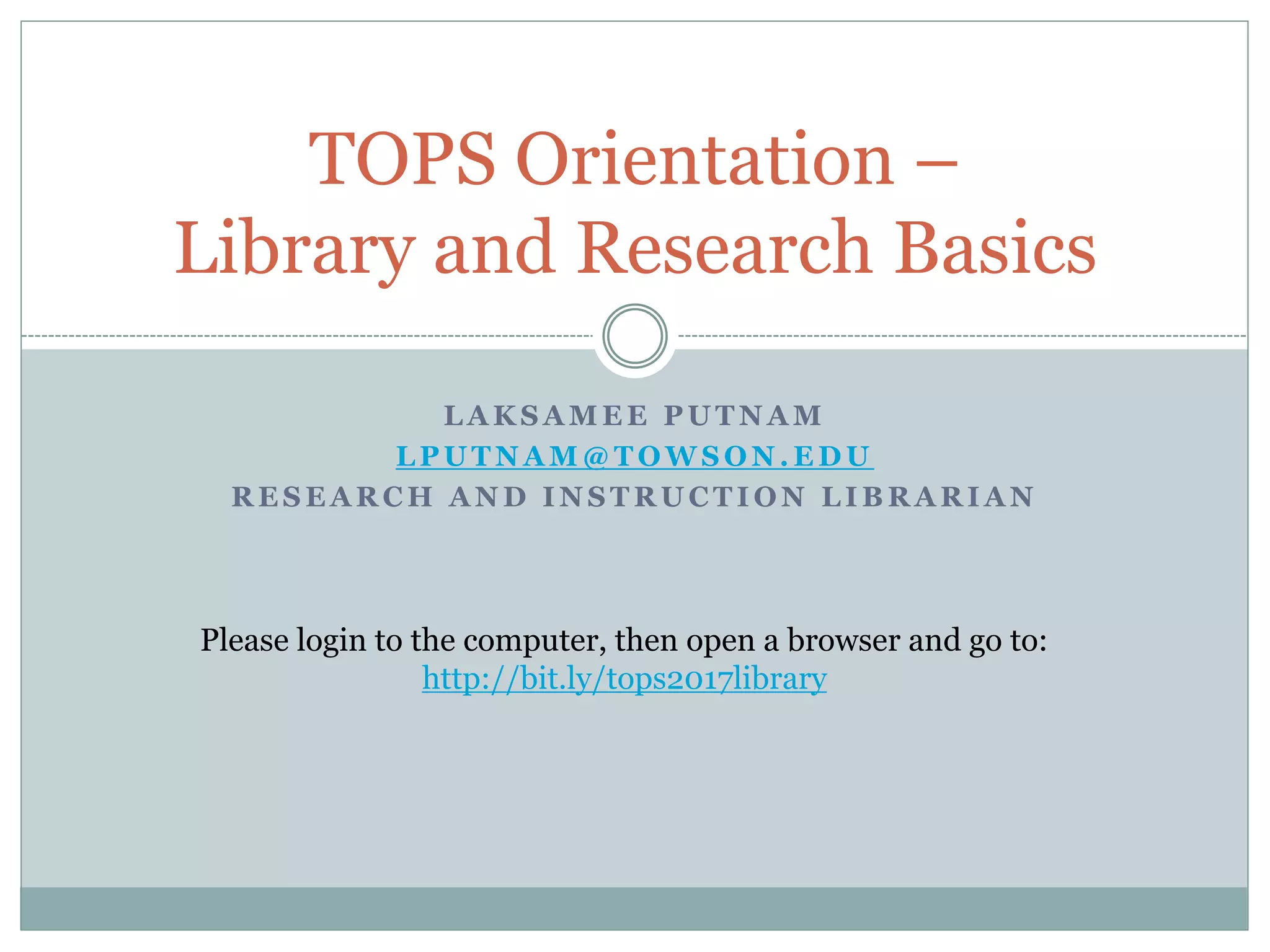 This document provides an overview of library resources and research basics for TOPS Orientation students. It introduces Laksamee Putnam as the research librarian and lists contact information. It then outlines the library's collections, including books, ejournals, databases, and computers. It provides tips for developing search strategies, evaluating sources, and searching the library catalog and databases. Finally, it directs students to complete a scavenger hunt and ask the librarian for help with career and major research.