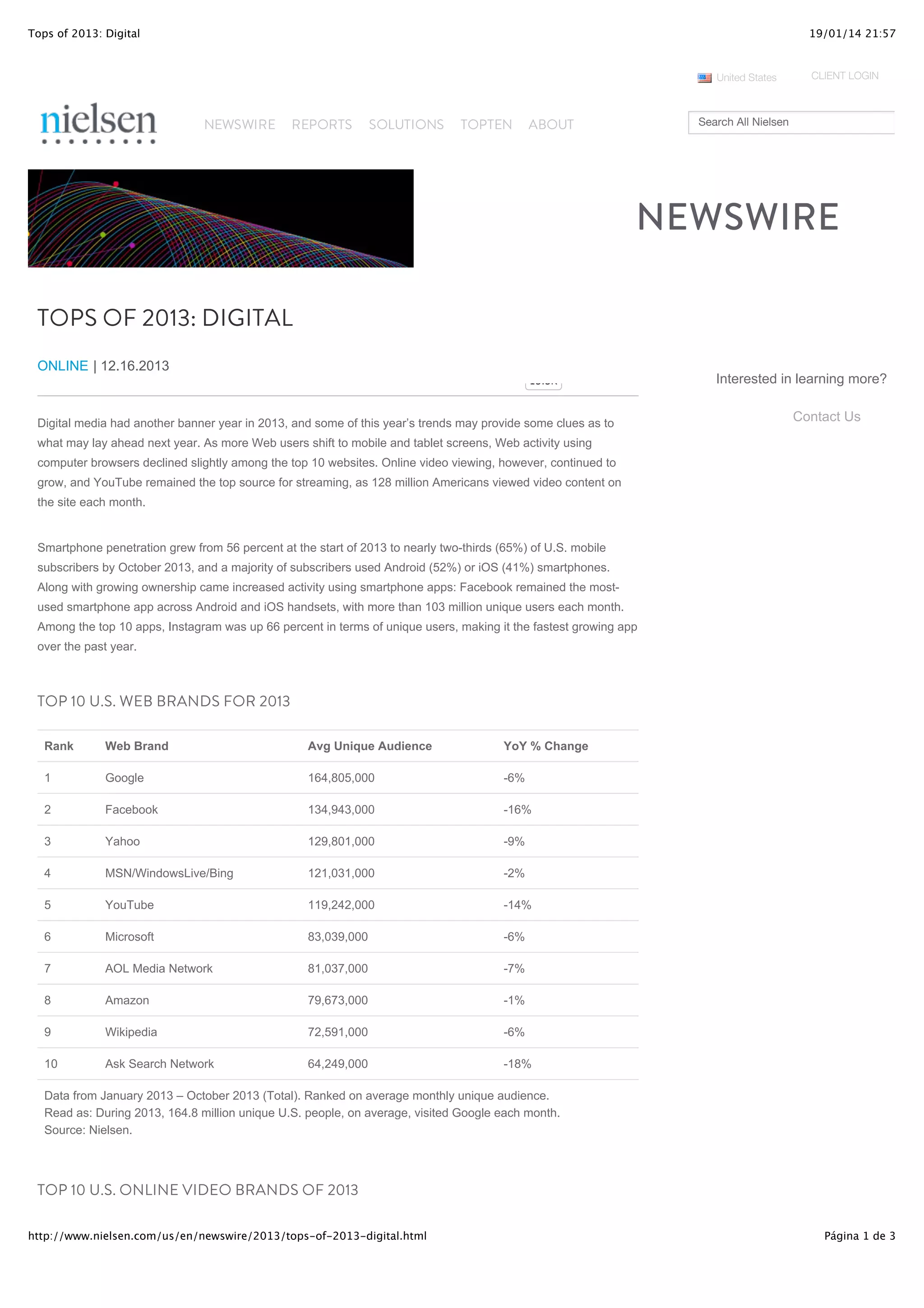 Digital media continued to grow in 2013, with online video viewing and smartphone use increasing. YouTube remained the top source for online video streaming, viewed by 128 million Americans each month. Facebook was the most used smartphone app, on 103 million devices monthly. Instagram saw the fastest growth among top apps, with unique users up 66%. Google remained the top online brand but saw declines along with other major sites like Facebook and Yahoo.