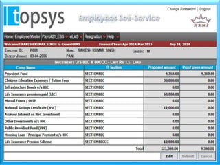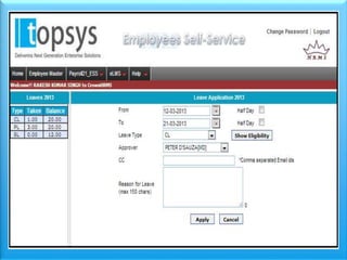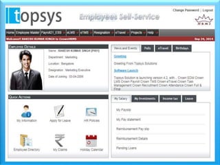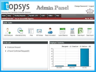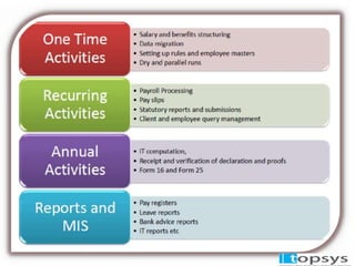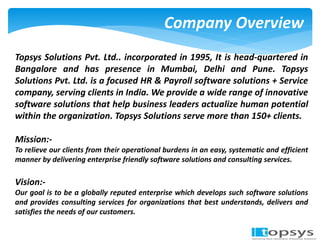 Topsys Solutions is an HR and payroll outsourcing company based in Bangalore that serves over 150 clients. It provides payroll processing and software solutions to relieve clients of operational burdens. Topsys' payroll outsourcing process involves clients submitting new hire, resignation, and time/attendance data, then Topsys processes payroll, provides reports, and distributes pay slips, allowing clients to focus on their core business.
