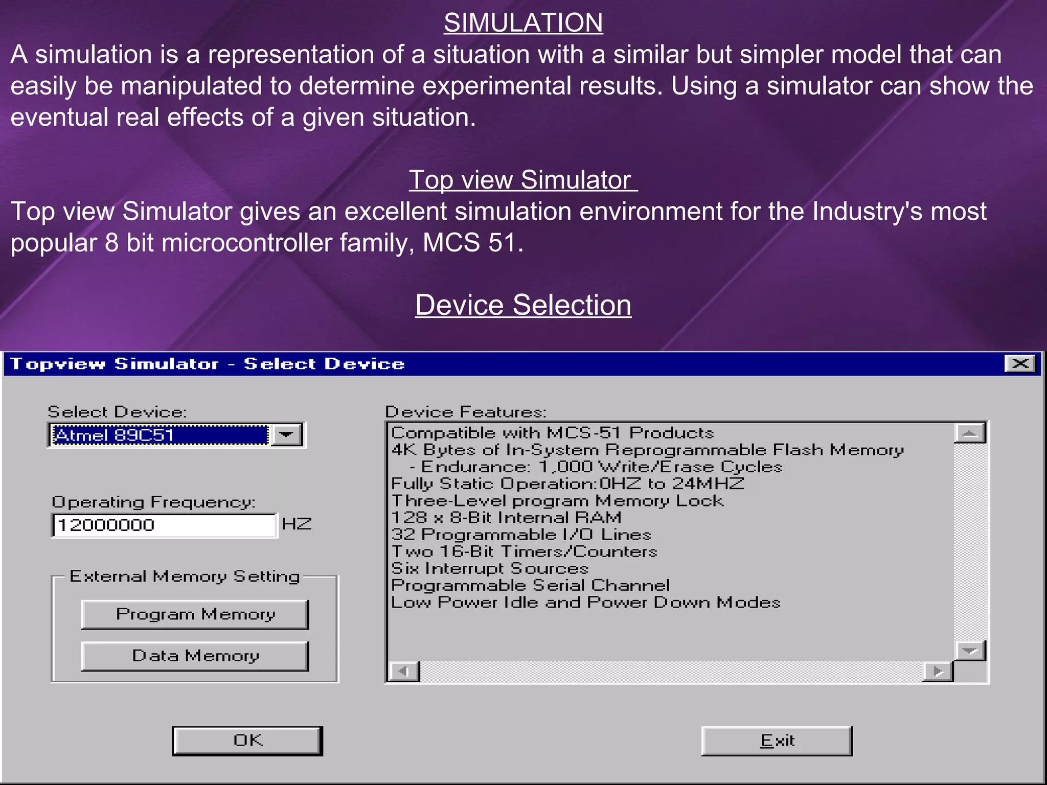 2) It describes Top View Simulator which simulates the popular 8-bit MCS 51 microcontroller family and includes windows to view the program, registers, memory, and other components.
