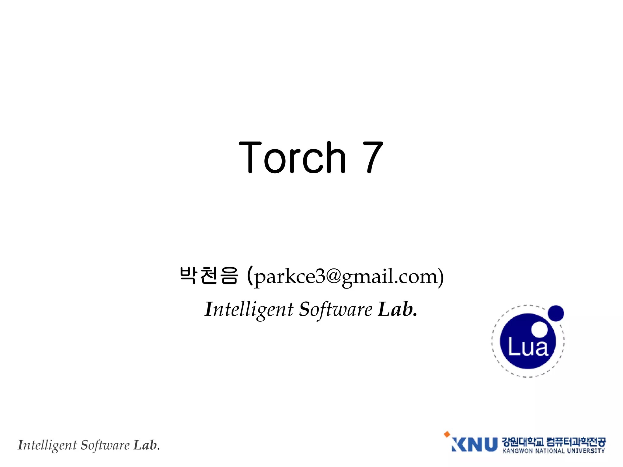 This document provides information about installing and using Torch 7, an open-source deep learning framework. It discusses installing Torch 7 on Linux, installing deep learning libraries for natural language processing and CUDA. It also gives examples of using Torch 7 for image processing and classification, including loading an image dataset and defining different types of neural network models like linear, MLP and convolutional networks.