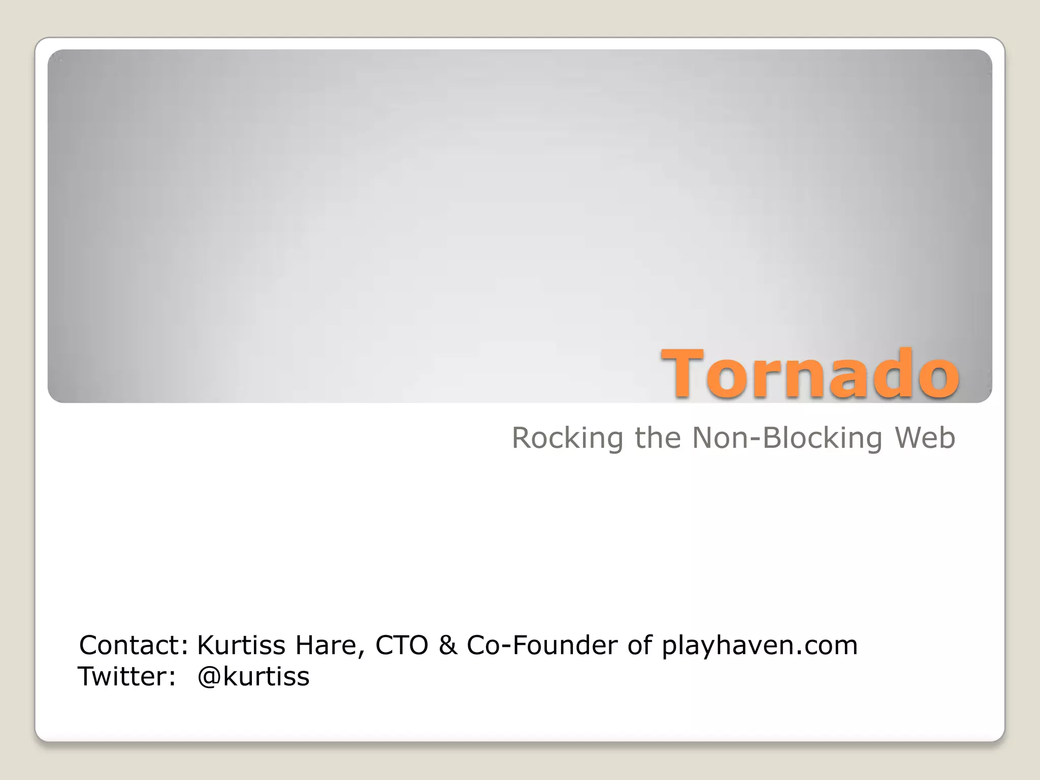 This document discusses the Tornado web server framework. It provides an overview of Tornado, including that it is a non-blocking and scalable web server that was used by FriendFeed and is now open-sourced by Facebook. It describes Tornado's architecture, which uses an IOLoop and callbacks instead of threads to remain asynchronous and non-blocking. An example "Hello World" application in Tornado is also provided. Performance comparisons show Tornado outperforming other frameworks like Node.js and Twisted.