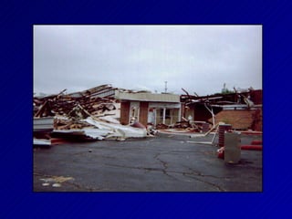 Tornadoes are rotating columns of air attached to thunderstorms that can reach the ground. They occur most frequently in the central US between March and August. Tornado wind speeds can exceed 300 mph and they can be over a mile wide. The damage and strength of tornadoes is measured using the Fujita scale, ranging from F0 to F5. Over the past 70 years in the US, tornadoes have caused over $25 billion in damage and injured or killed over 80,000 people.