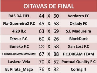 The document contains results from matches in the Primeiro MATA - MATA tournament. It lists scores from the group stage matches, followed by the round of 16, quarterfinals, and semifinals. The semifinals pairings are Verdazzo FC vs. Tereus F.C. and F.C.DREAM TEAM vs. Coringirl.