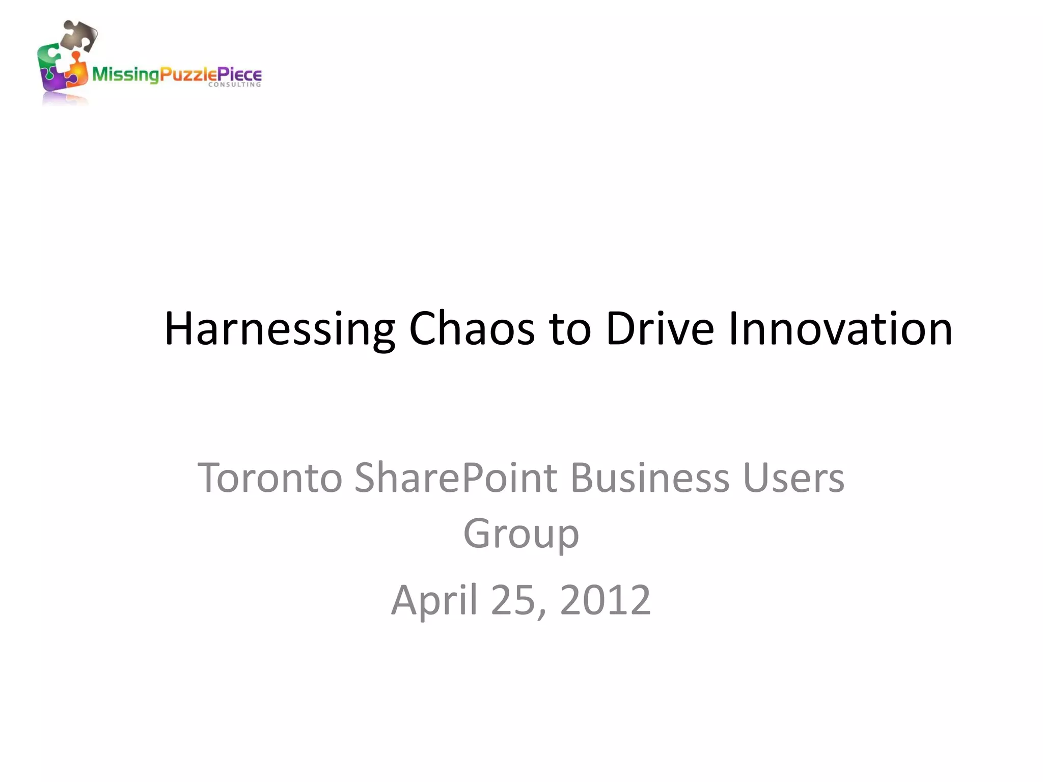 The document discusses harnessing chaos to drive innovation. It provides an agenda for a presentation on encouraging innovation through knowledge management. The presentation covers defining innovation, ways to encourage it such as through knowledge sharing and risk-taking. It also discusses using knowledge management processes like communities of practice, lessons learned and peer assists to drive innovation. Finally, it presents a case study of a FMCG company that saw sales and profits increase significantly by connecting people through a social application to share experiences in emerging markets.