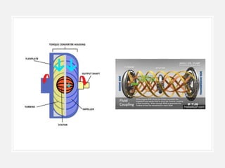 The document discusses the torque converter and its role in automatic transmissions. It explains that the torque converter uses transmission fluid to transfer power from the engine to the transmission hydrodynamically. The torque converter contains an impeller connected to the engine, a turbine connected to the transmission input shaft, and a stator that redirects the fluid flow to multiply torque. The automatic transmission also contains a planetary gearset and hydraulic controls to shift gears without a clutch pedal.