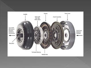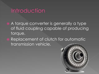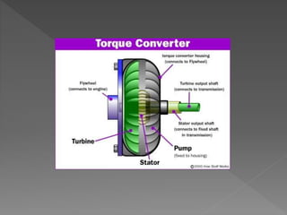 A torque converter is a fluid coupling used in automatic transmissions that transfers power from the engine to the transmission. It contains an impeller connected to the engine, a turbine connected to the transmission, and a stator in between. In different operating modes like stall and acceleration, the torque converter can multiply torque to help vehicles start moving or can act like a fluid coupling at higher speeds. Problems that can occur include overheating, stator clutch issues, blade damage, and housing distortion from extreme operating conditions.