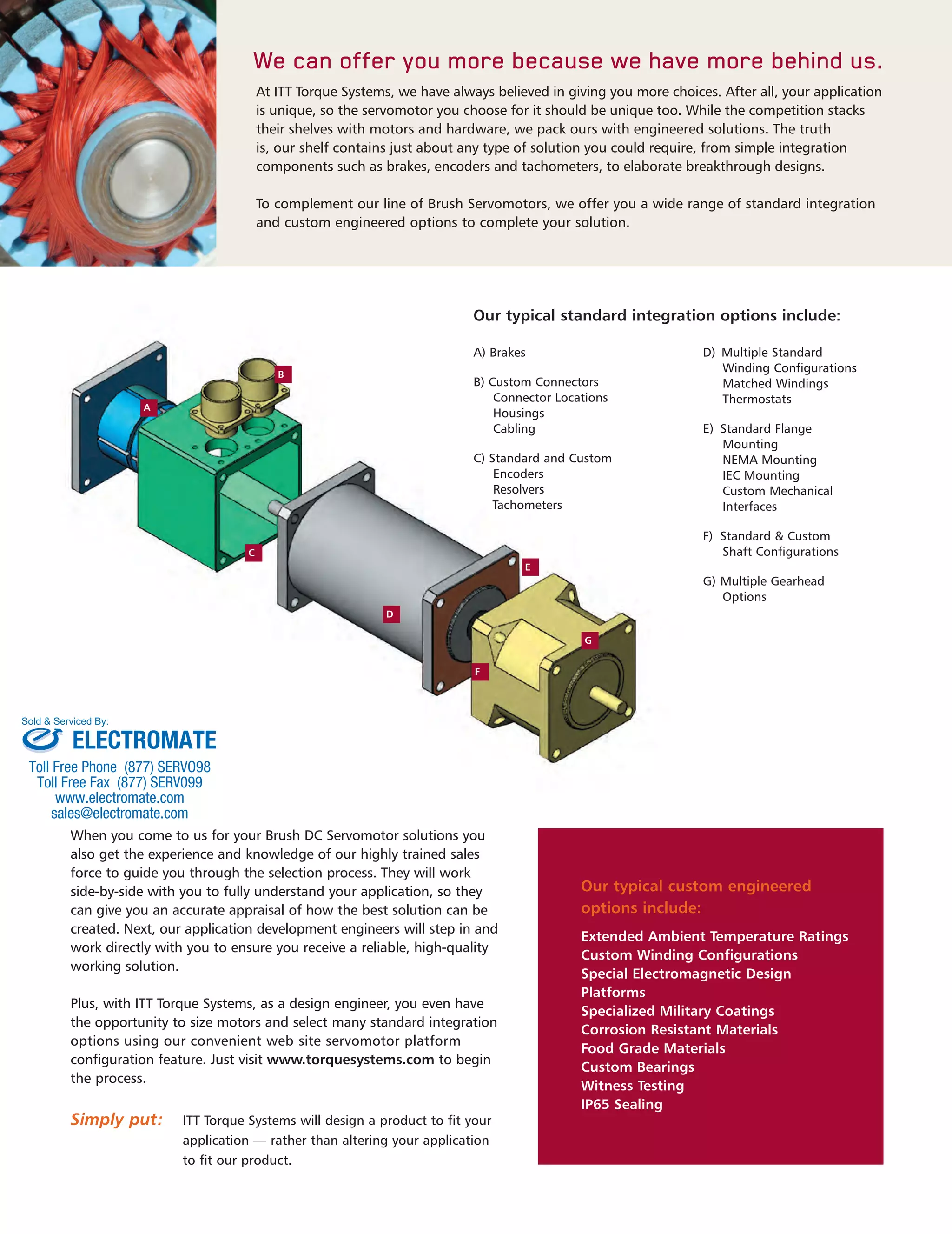 This document provides information on torque systems and brush DC servomotors from ITT Torque Systems. It discusses the company's ability to customize solutions and lists standard integration options including brakes, encoders, windings, and gearheads. Tables show specifications for multiple motor platforms including torque, power, and inertia. The document also includes dimensional information and diagrams for motor sizing.