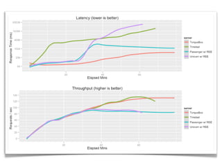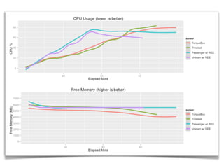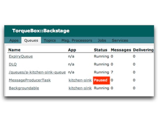 The document summarizes TorqueBox, which allows Ruby applications to run on the JBoss Application Server. TorqueBox combines JRuby and JBoss AS to provide features like clustering, load balancing, high availability, messaging, background jobs, and long-running services to Ruby applications. It allows Ruby applications to leverage Java libraries and tools while retaining the simplicity and flexibility of Ruby.