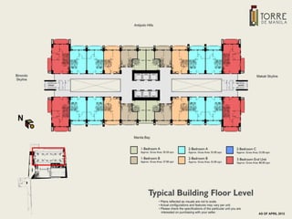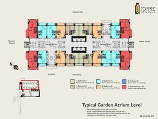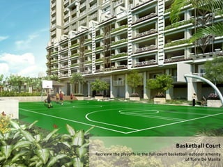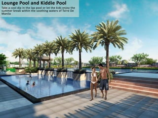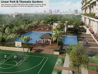 The document outlines the Torre de Manila project, a high-rise residential condominium featuring a contemporary art deco theme with 923 units across 42 stories. It includes detailed information on the site's amenities, unit types, parking availability, and location accessibility, as well as neighboring attractions. The development emphasizes open space, various recreational facilities, and innovative building features to provide residents with a luxurious living environment.