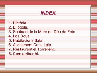 ÍNDEX. 1. Història.2. El poble. 3. Santuari de la Mare de Déu de Foix. 4. Les Dous. 5. Habitacions Sala. 6. Allotjament Ca la Laia. 7. Restaurant el Torrellenc. 8. Com arribar-hi.