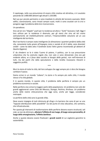 Il documento riflette sull'importanza di affrontare le sfide legate allo sviluppo urbano e alla sostenibilità, in particolare nel contesto di Expo 2015 e delle sue implicazioni per le periferie. Si evidenzia la necessità di considerare le periferie come parte integrante e viva della vita metropolitana, piuttosto che come aree marginali. Un approccio inclusivo e sostenibile è cruciale per garantire che gli eventi di grande portata abbiano un impatto positivo e duraturo sulle comunità locali.