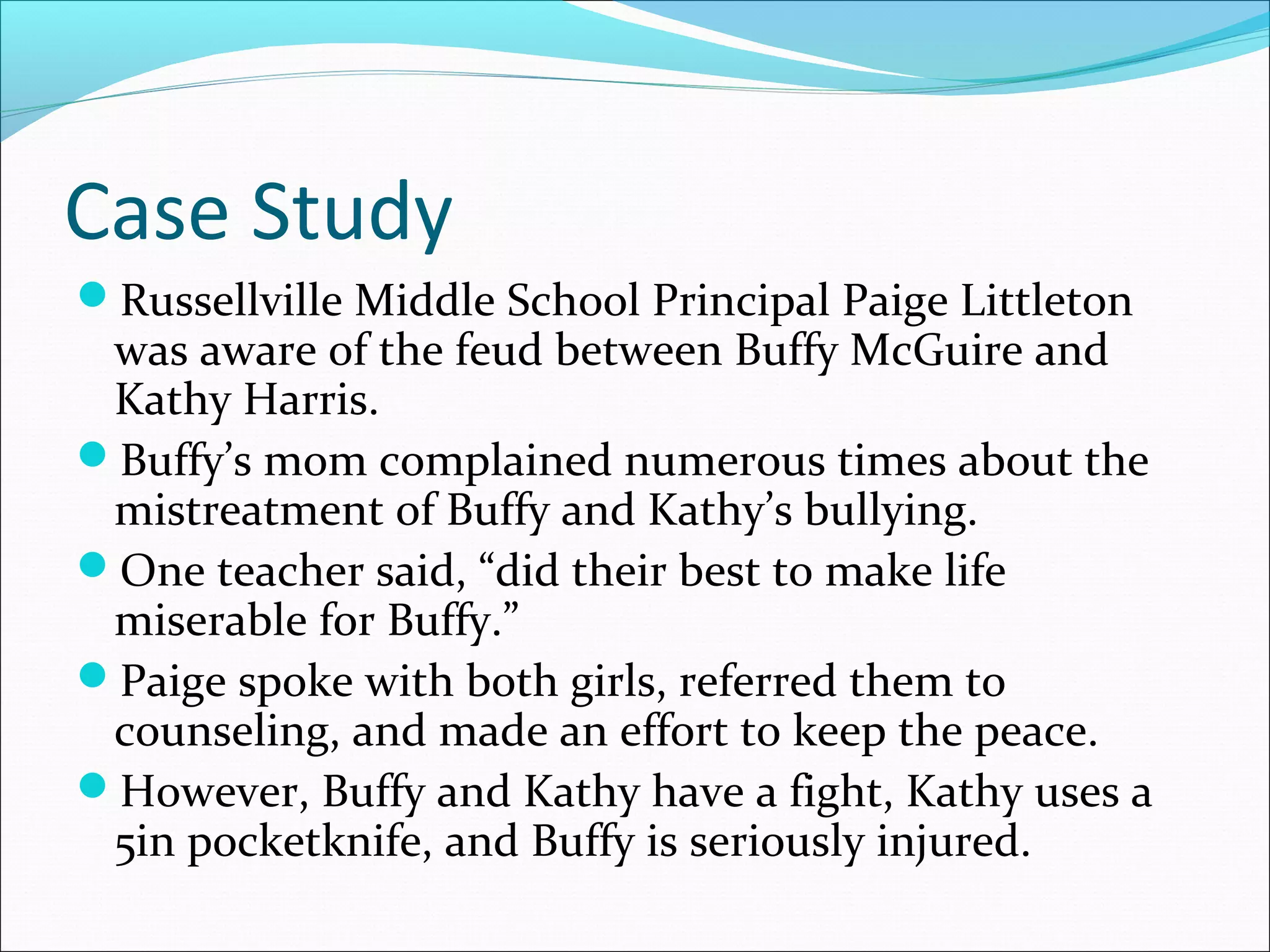 The document discusses a case involving bullying at Russellville Middle School, where a serious altercation between two students resulted in one being injured and hospitalized. It covers the legal implications of tort liability for schools and teachers, particularly regarding negligence and the duty of care educators owe to students. Additionally, it outlines various defenses against negligence claims and emphasizes the importance of managing risks to avoid potential lawsuits.