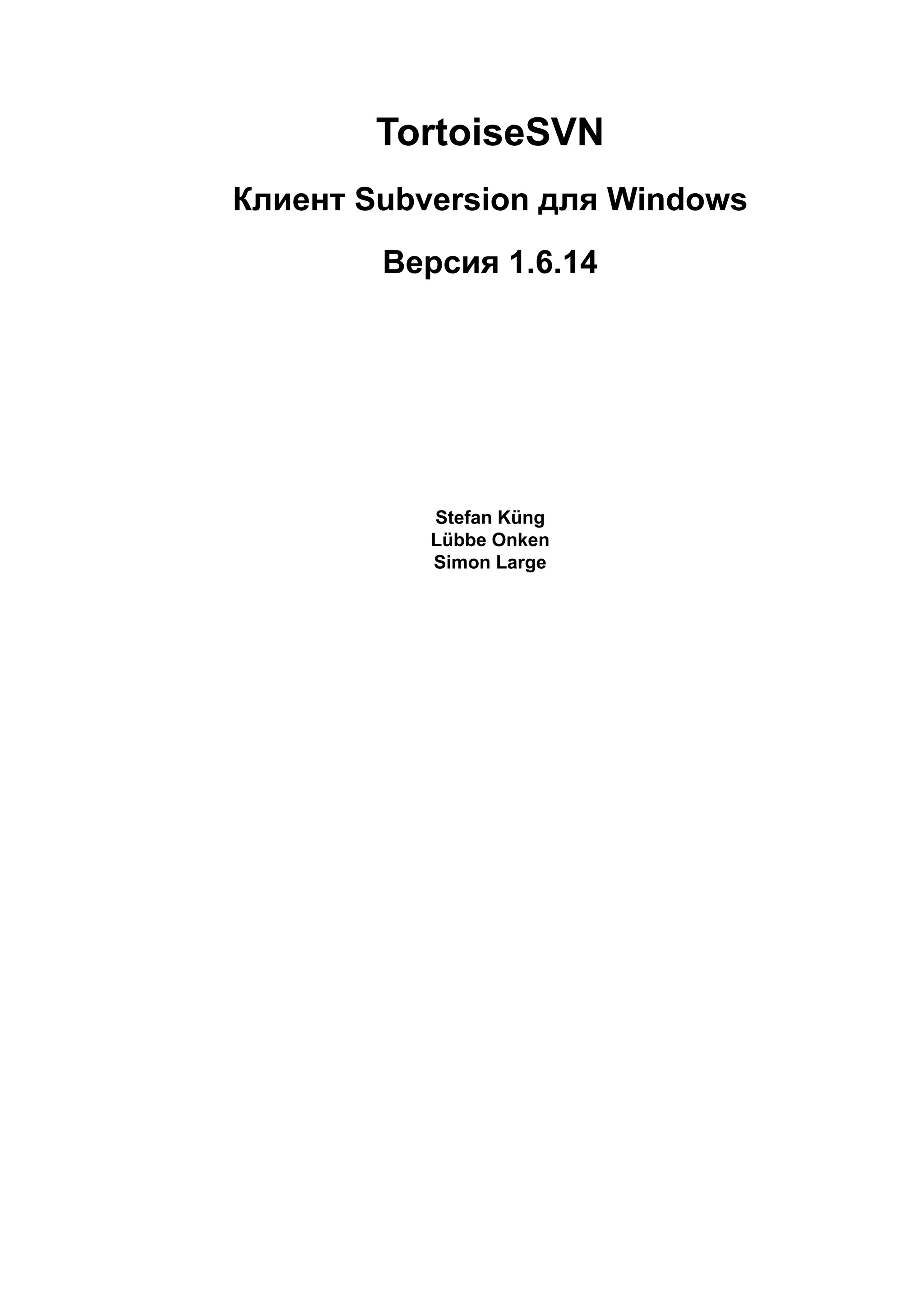Документ описывает TortoiseSVN, клиент Subversion для Windows версии 1.6.14, включая его возможности, установки и принципы работы. Он содержит детализированные инструкции по управлению версиями, созданию хранилищ, а также ежедневному использованию программного обеспечения. В документе также обсуждаются различные концепции, такие как управление конфликтами и интеграция с системами отслеживания ошибок.
