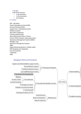 The document outlines a strategic plan for a retail group aiming to become a market leader in Indian retail by enhancing customer satisfaction and expanding to 150 outlets by 2011, targeting a 15% market share. Key business functions include merchandising, vendor management, and inventory control, with specific IT budgets allocated for operations, promotions, and analytics. The document also discusses IT infrastructure enhancements, including ERP systems, digital marketing, and integrated workflows to improve operational efficiency.