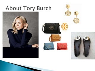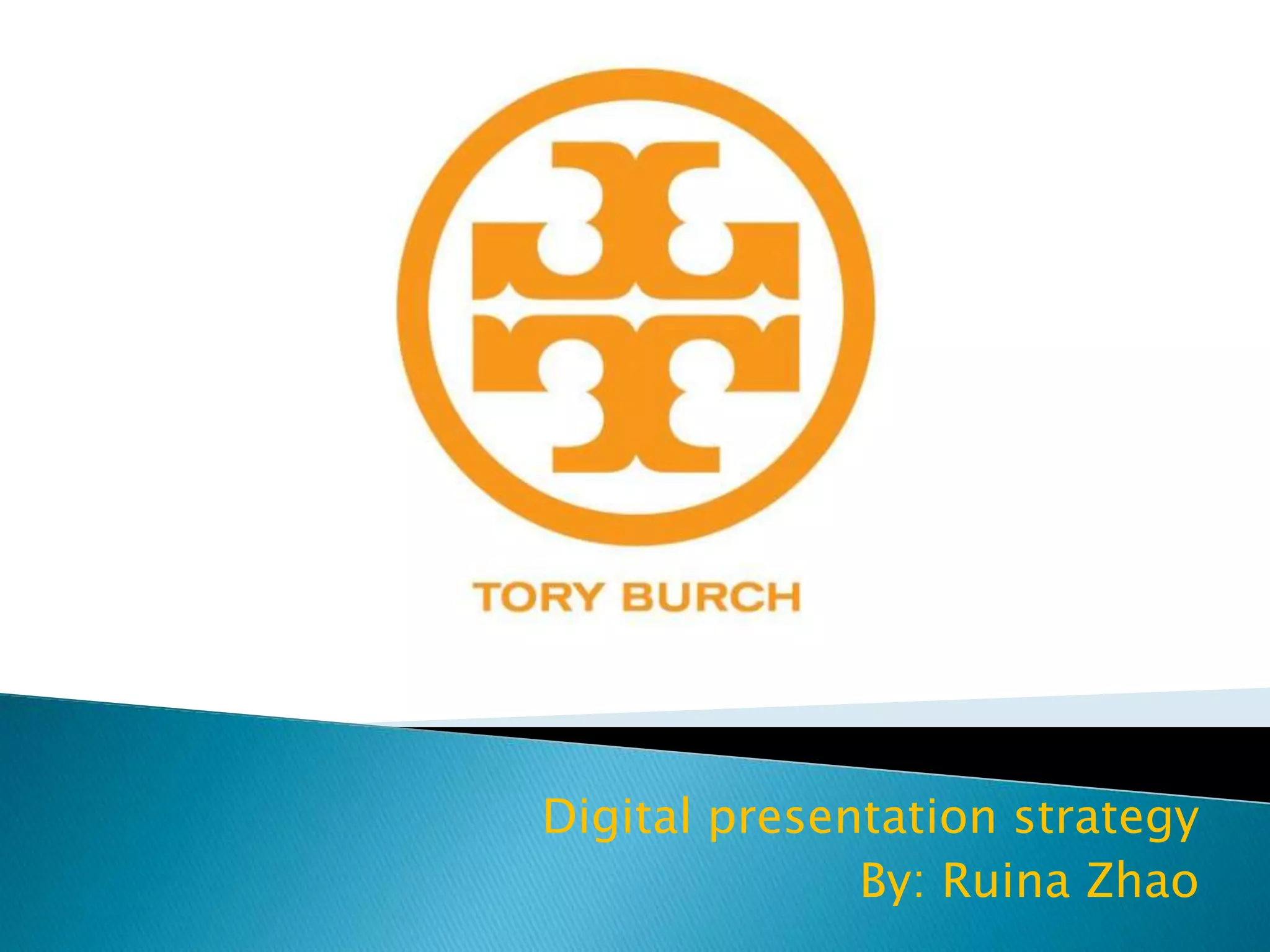 The document outlines Tory Burch's digital presentation strategy to promote its brand. It aims its products at women ages 24-56 from middle to upper class backgrounds interested in fashion trends. The strategy focuses on the US and developing countries. It launches a campaign called "So Tory Burch" across blogs, social media like Twitter, Pinterest, Facebook, YouTube and Instagram. It emphasizes engaging content, contests and celebrity endorsements. The company also plans a mobile app and estimates the total budget at $4.39 million.