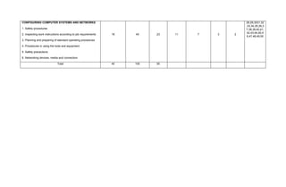 The document provides a table of specification for a computer systems servicing course for the first quarter of the 2019-2020 school year. It outlines three main topics that will be covered: personal entrepreneurial competencies, environment and market, and configuring computer systems and networks. For each topic it lists the specific lessons, the number of days each will be taught, the percentage weight of each topic, and the number and placement of test items assessing each lesson. Personal entrepreneurial competencies makes up 10 days or 25% of the course and will be assessed by 5 test items. Environment and market makes up 12 days or 30% of the course and will be assessed by 7 test items. Configuring computer systems and networks makes up 18