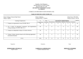 1. The document provides a table of specifications for an English class at Siljagon National High School. It outlines 7 learning competencies for an 8th grade class and 4 competencies for a 10th grade class.