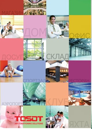 Документ представляет собой описание модельного ряда кондиционеров 2013 года бренда Tosot, производимых компанией Gree. В нем освещены ключевые характеристики, технологии и функции кондиционеров, такие как инверторное управление и система самоочистки, а также предложения для комфортного использования и заботы о здоровье. Продукция включает разнообразные устройства для бытового и коммерческого использования, подчеркивая акцент на качестве и инновациях.