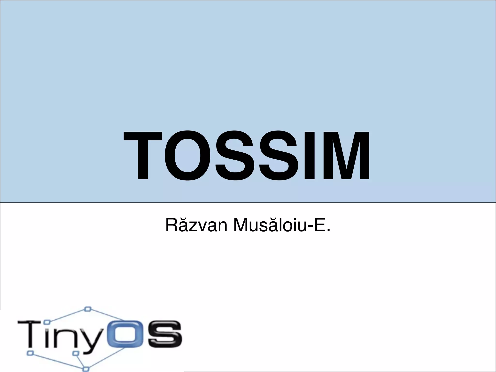 TOSSIM is a discrete event simulator for TinyOS applications that runs on a PC. It simulates MicaZ motes and uses a radio noise model to simulate realistic wireless conditions. The core components of TOSSIM include classes for the Tossim simulator, Radio, Mote, Packet, and Mac layers.