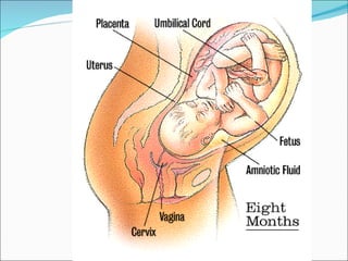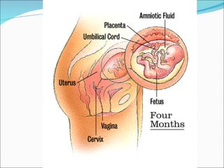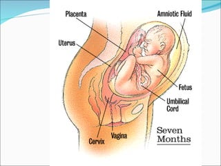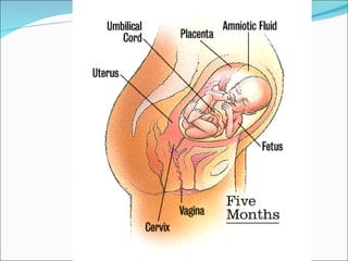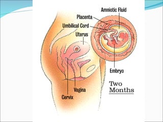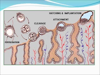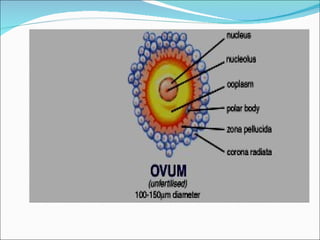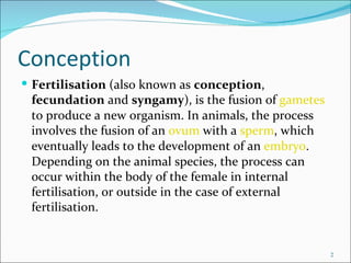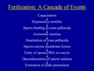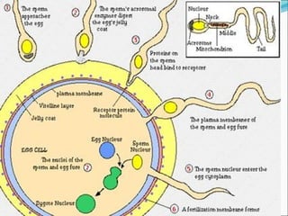 Fertilization occurs when an ovum fuses with a sperm, leading to the development of an embryo. Sperm must travel through the female reproductive tract, confronting barriers like cervical mucus, before reaching the ampulla where fertilization occurs. Capacitation and the acrosome reaction prepare the sperm for fertilization. Gamete fusion results in the formation of a zygote containing male and female pronuclei. The zygote undergoes cleavage and develops into a blastocyst that implants in the uterus, initiating pregnancy. Pregnancy can be detected through urine or blood tests that detect human chorionic gonadotropin, a hormone produced by the developing placenta.