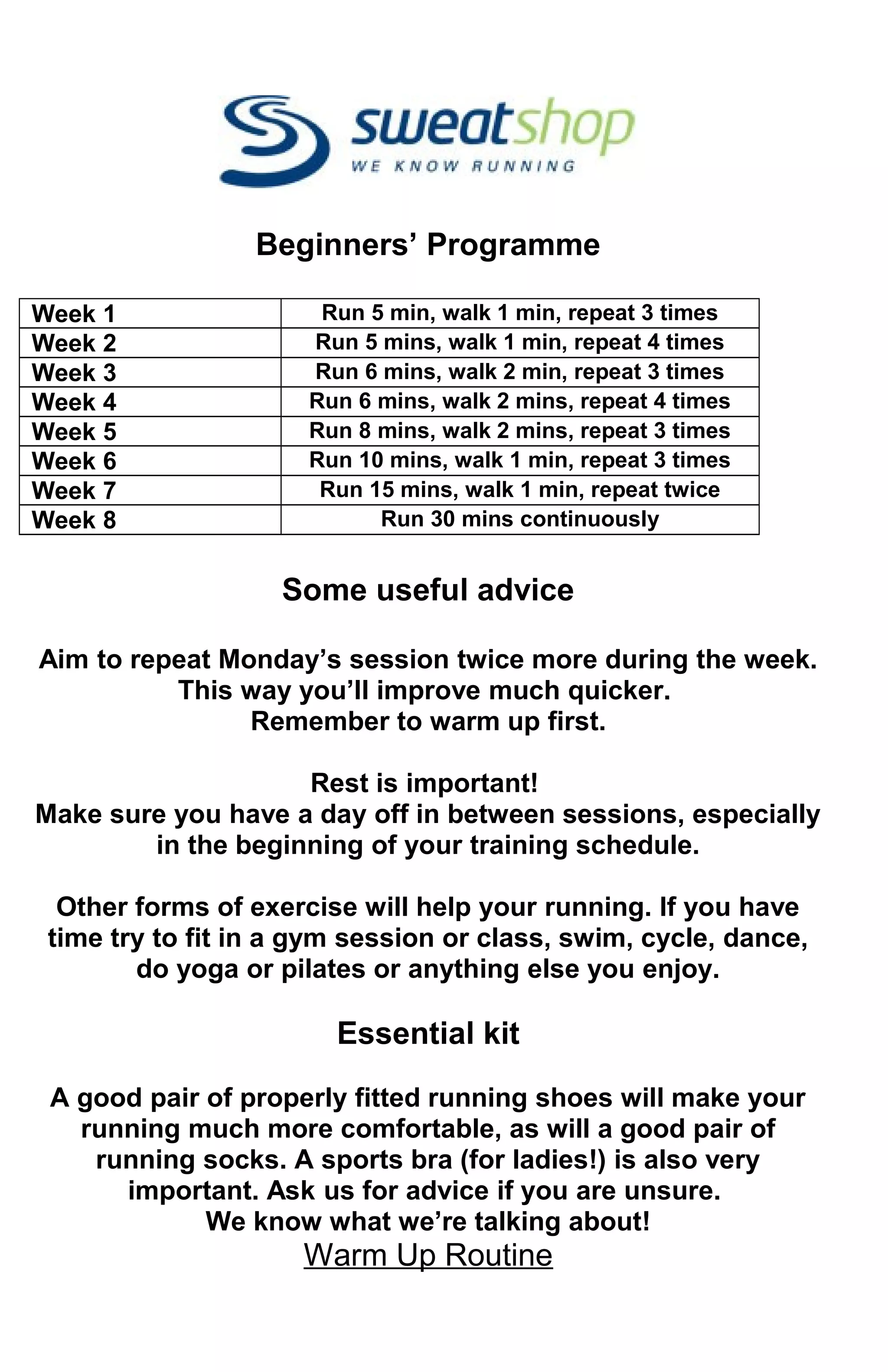 This document outlines an 8-week beginner's running programme that gradually increases duration and decreases rest periods over time. It provides useful advice such as repeating sessions twice a week for quicker improvement, warming up before runs, and taking rest days between sessions, especially at the start. Additional forms of exercise are recommended to support running progress. Essential running gear includes properly fitted shoes, socks, and a sports bra, and advice is given on warm up and post-run stretches.