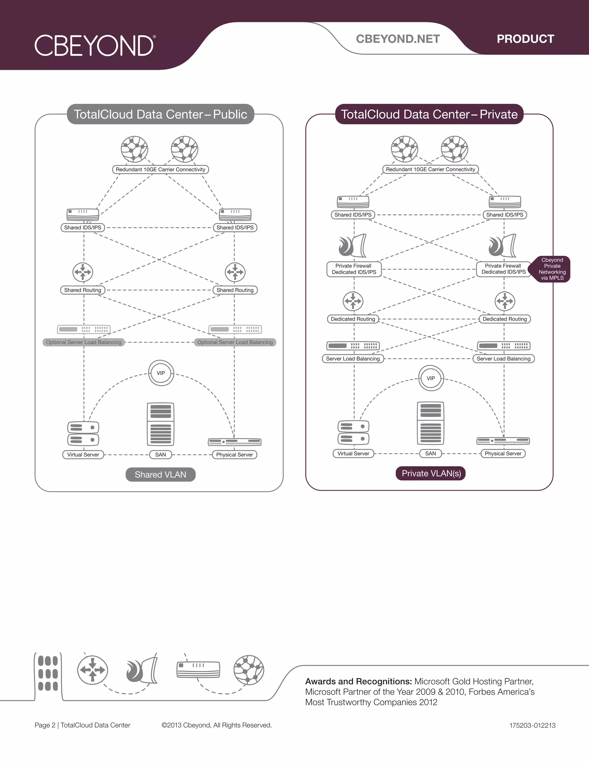 Cbeyond offers two versions of its TotalCloud Data Center - Public and Private. The Public option provides a secure slice of cloud computing resources with shared firewall, routing, and intrusion detection. The Private option offers additional dedicated security features like private networking and load balancing. Both options provide managed infrastructure, storage, backups and support to businesses without the cost of owning their own data center equipment and expertise.