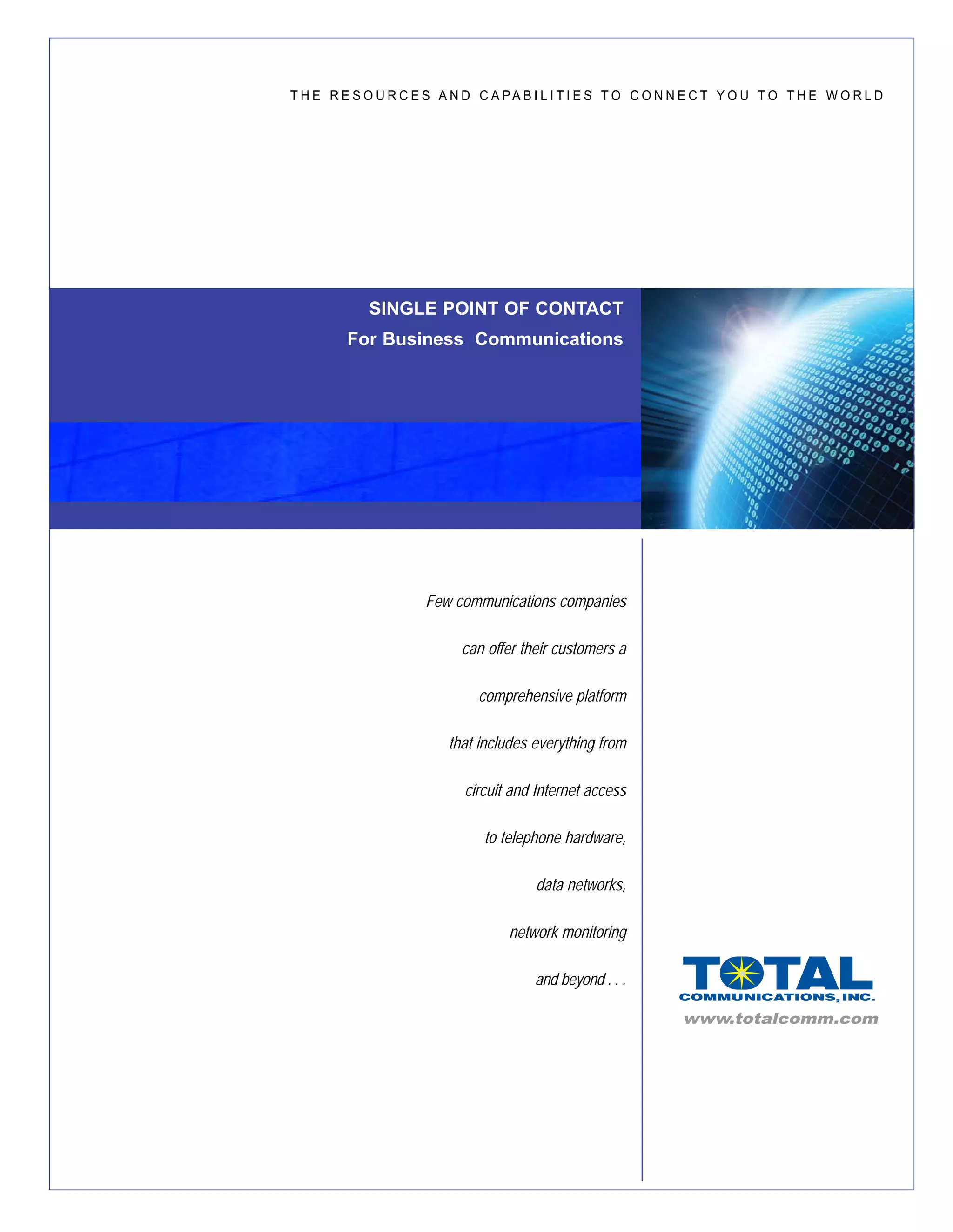 Total Communications provides comprehensive business communication solutions including voice systems, data networks, carrier services, internet/co-location services and structured cabling. As a single point of contact, they have the resources and experience to connect businesses to the world through cutting-edge technologies and unsurpassed service. They are recognized for excellence in customer satisfaction and have become one of the largest privately-owned telecommunications companies.