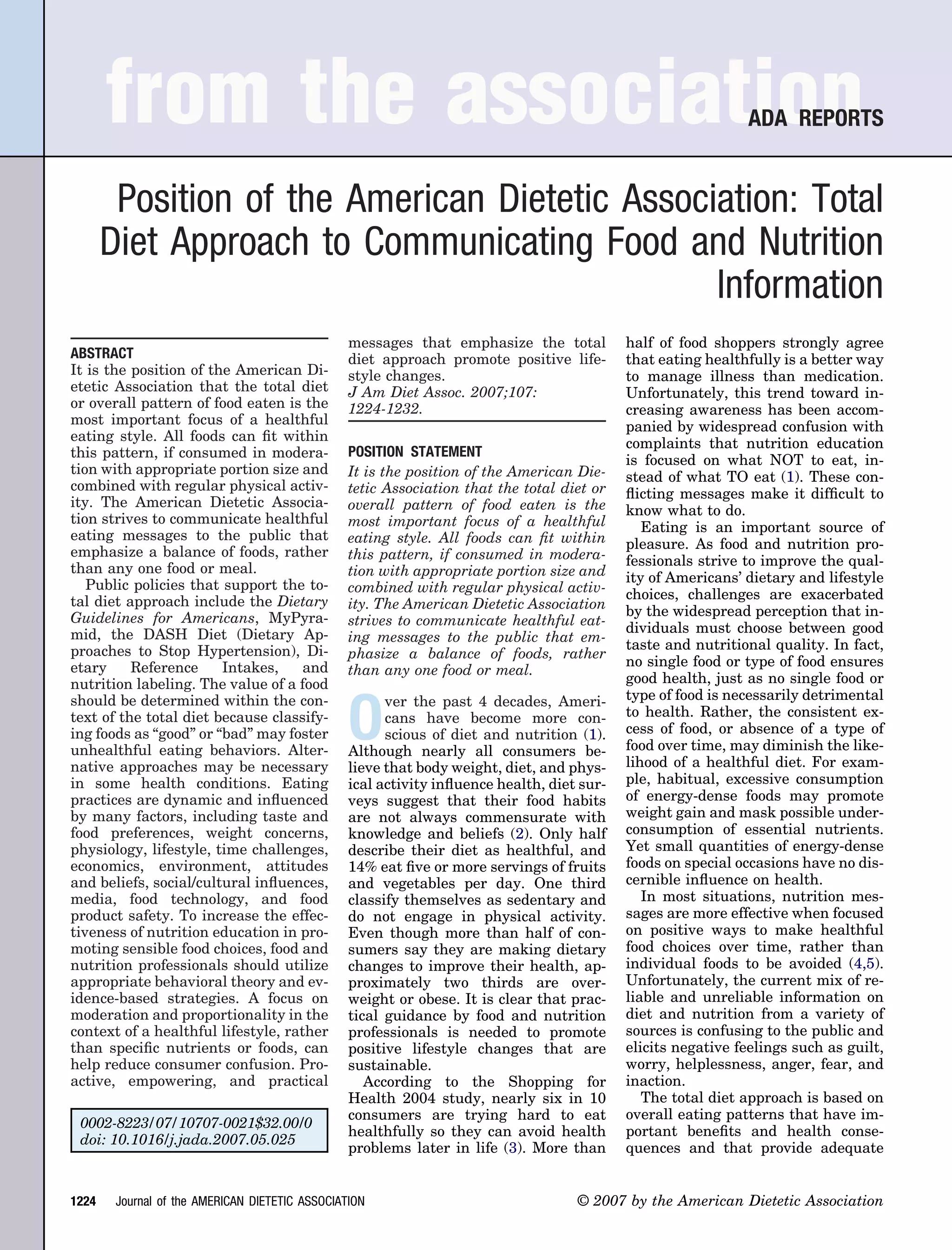 The document discusses the American Dietetic Association's position that a total diet approach, which focuses on overall eating patterns over time rather than individual foods, is most important for healthy eating. It emphasizes eating a variety of nutrient-dense foods in moderation. The document also discusses how federal nutrition guidance like the Dietary Guidelines for Americans supports this total diet approach. Finally, it discusses challenges communicating nutrition information to the public and strategies for effective nutrition education campaigns.