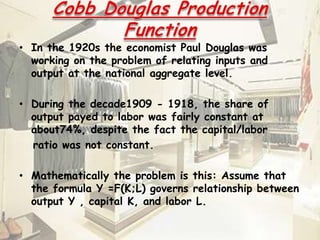 This document discusses the Cobb-Douglas production function, which is used to model the relationship between inputs like capital and labor, and total output of production. It defines key terms like elasticity of labor and capital, and describes different methodologies for calculating elasticity. It also discusses how increasing a company's capital stock through investment can lead to economic growth by enabling increased profits and efficiency through new machinery and projects.